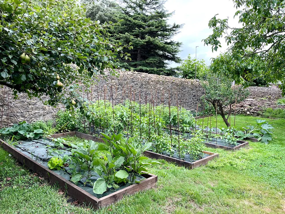 Al final de la finca, junto a los majestuosos nogales, se encuentra un pequeño huerto de temporada y plantas aromáticas, que no solo embellece el paisaje, sino que también ofrece un vínculo directo con la tierra y los ciclos naturales.